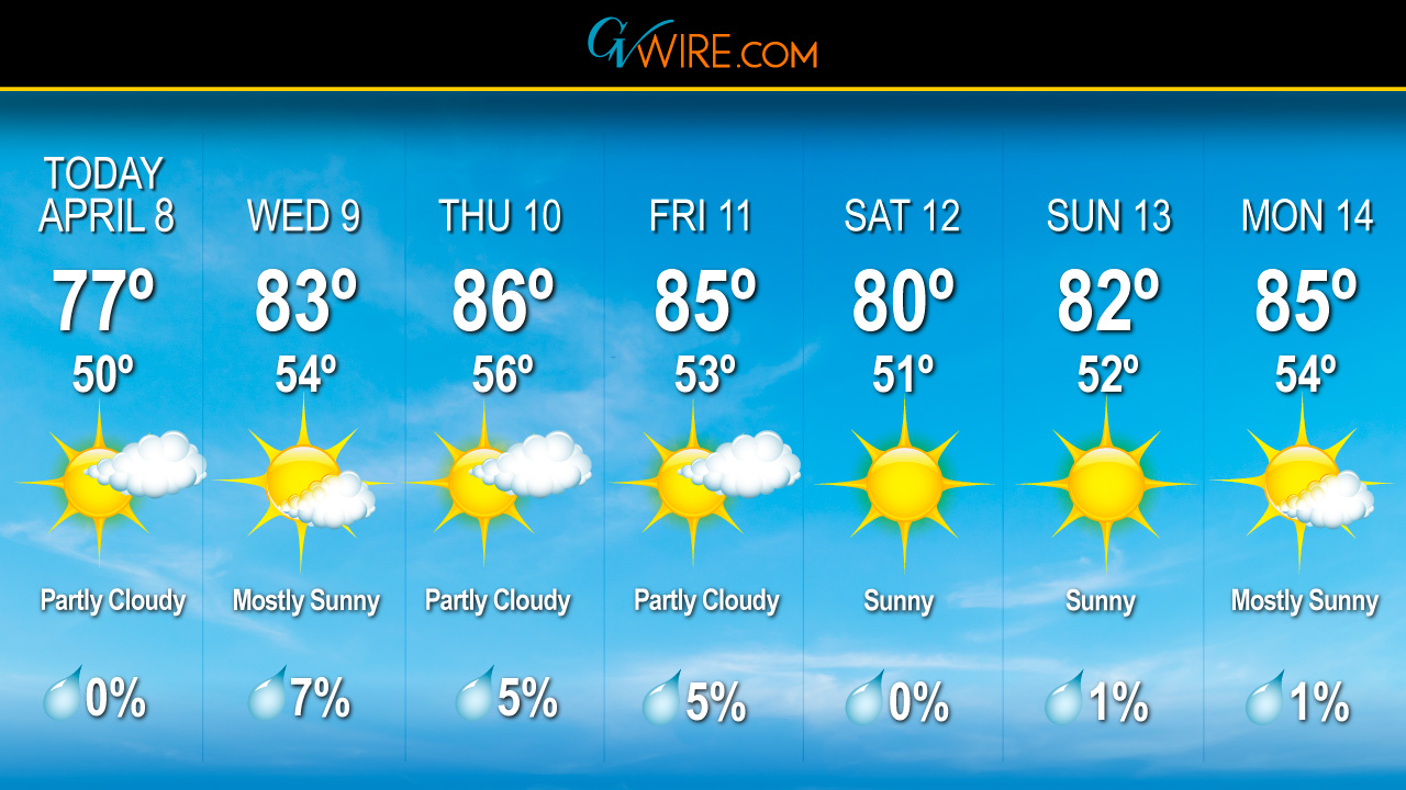Fresno’s forecasts for this week and weekend: Tuesday, high of 77, overnight low of 53; Wednesday, 82 high, 56 low; Thursday, 86 high, 57 low; Friday, 84 high, 55 low; Saturday, 78 high, 50 low; Sunday, 78 high, 52 low; Monday, a high of 82.