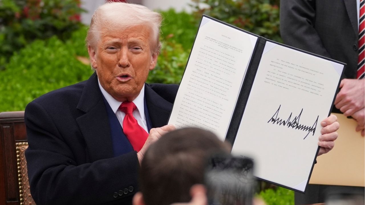 President Donald Trump holds a signed executive order during an event to announce new tariffs in the Rose Garden of the White House, Wednesday, April 2, 2025, in Washington. (AP/Evan Vucci)