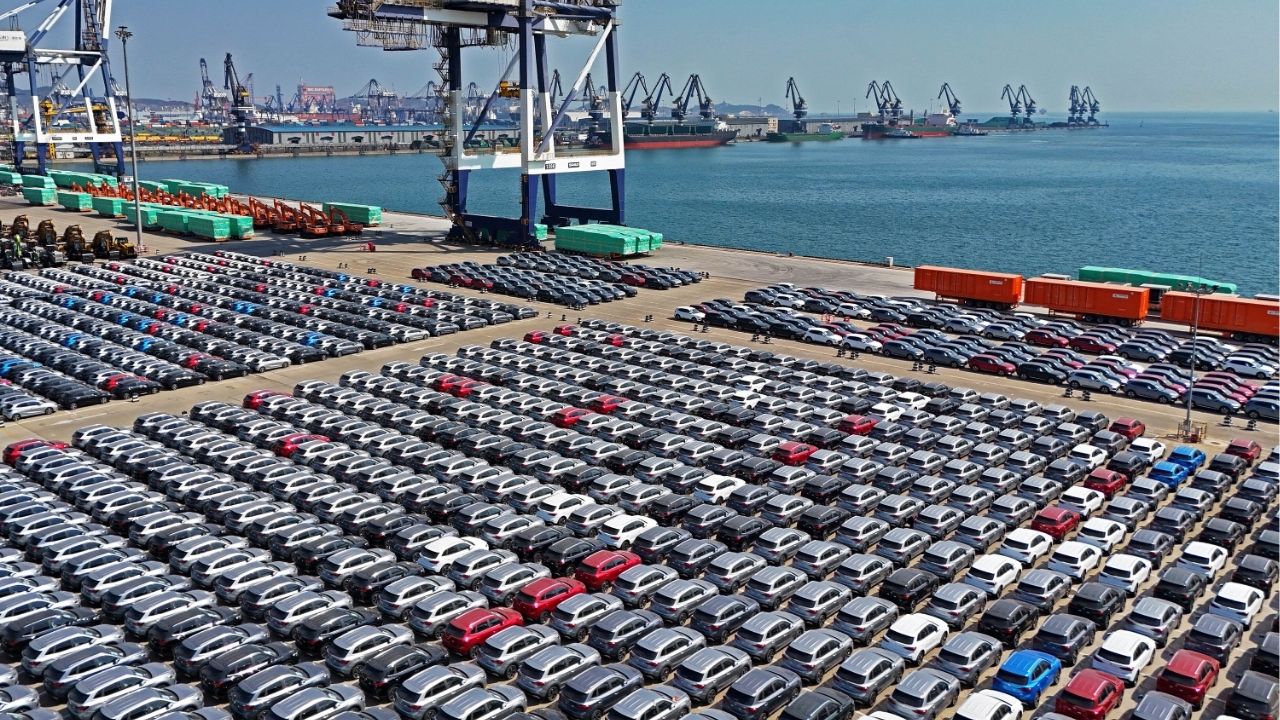 An aerial view of new cars waiting for shipment at a pier for ro-ro ships in Yantai city in eastern China's Shandong province Sunday, March 30, 2025. (Chinatopix Via AP)