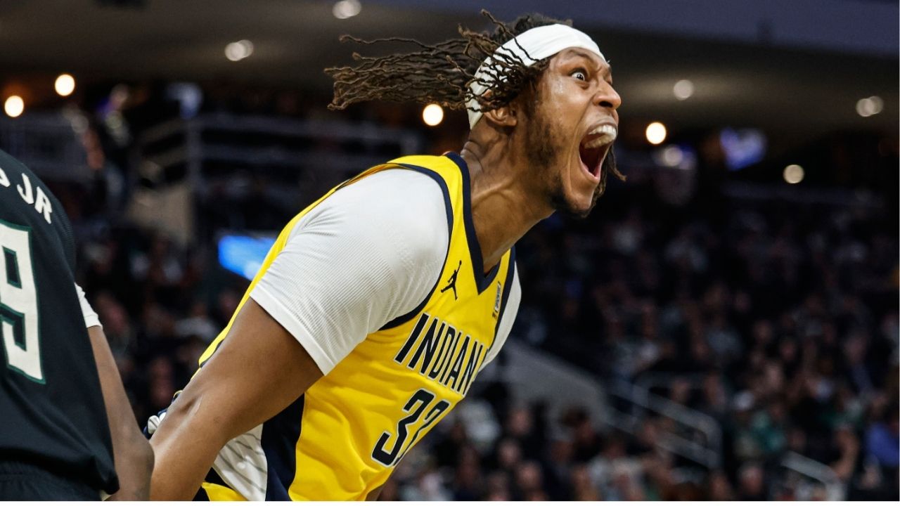 Indiana Pacers' Myles Turner (33) reacts after dunking over Milwaukee Bucks' Giannis Antetokounmpo during the second half of Game 4 of a first-round NBA basketball playoff series Sunday, April 27, 2025, in Milwaukee. (AP/Jeffrey Phelps)