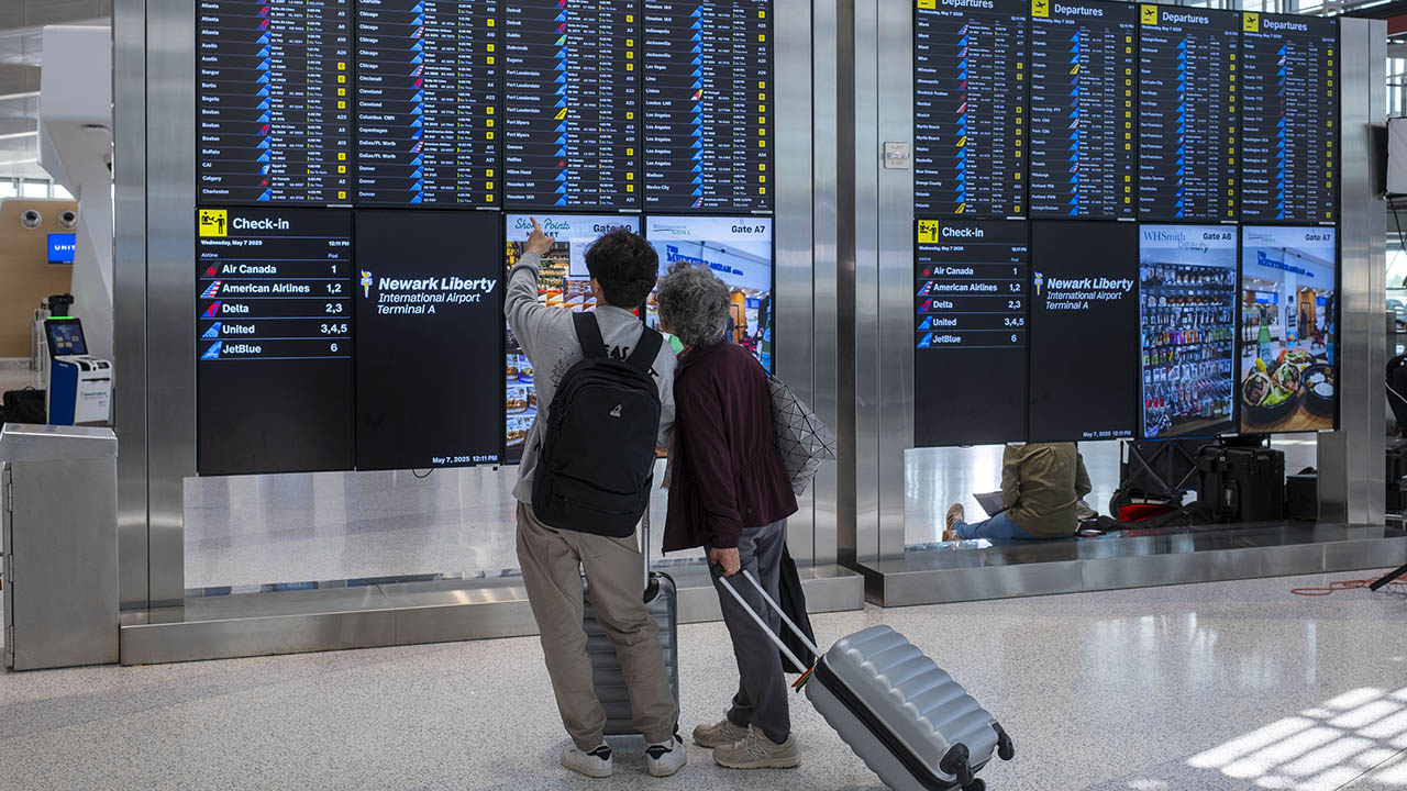 FILE — Travelers look at flight statuses at Newark Liberty International Airport in New Jersey, May 7, 2025. After a series of air travel incidents, including recent disruptions at a busy New Jersey airport, Sean Duffy, the transportation secretary, has sought to blame the previous administration for issues plaguing the Federal Aviation Administration. (Dakota Santiago/The New York Times)