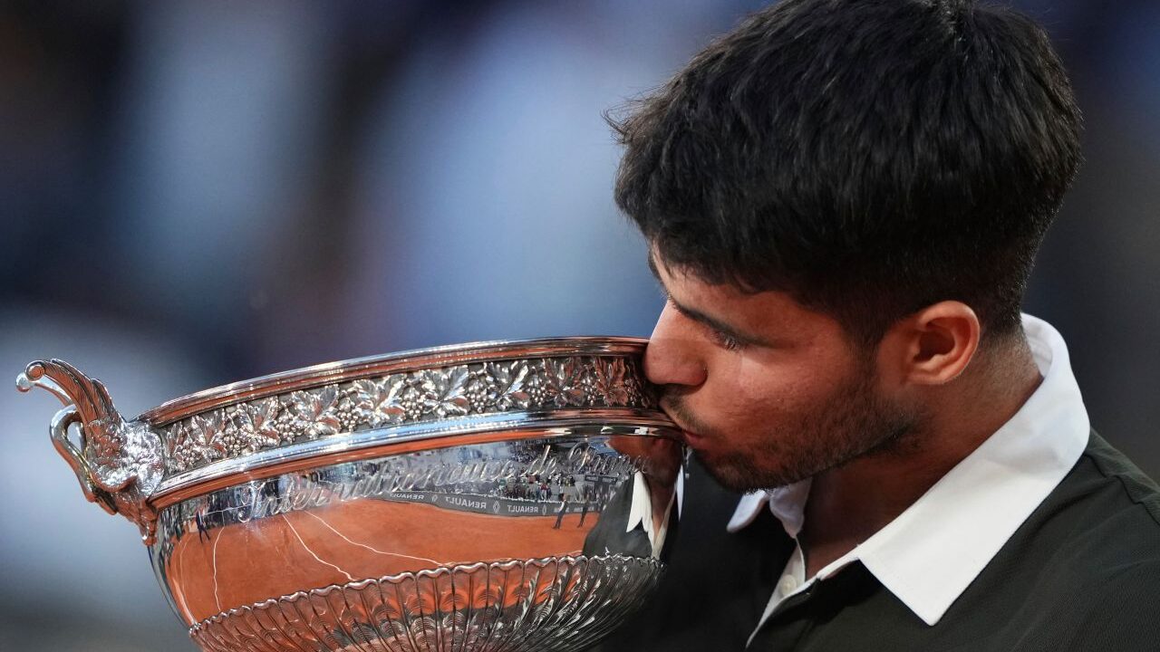 Spain's Carlos Alcaraz celebrates with the trophy after winning the final match of the French Tennis Open against Italy's Jannik Sinner at the Roland-Garros stadium in Paris, Sunday, June 8, 2025. (AP/Lindsey Wasson)
