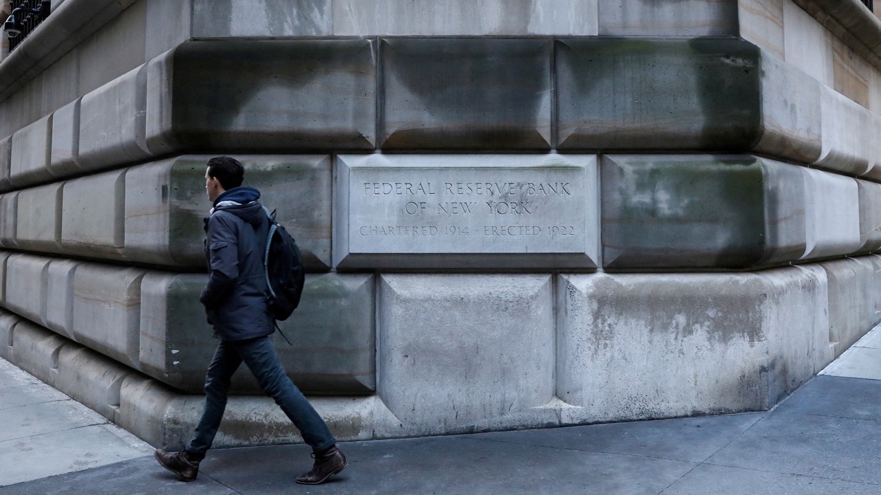 FILE PHOTO: A man passes by the cornerstone on the Federal Reserve Bank of New York in the financial district in New York City, U.S., March 4, 2019. REUTERS/Brendan McDermid/File Photo