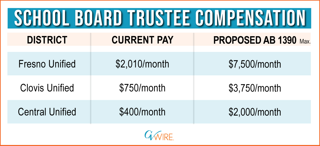 Fresno Unified trustees could earn up to $90,000 a year — a nearly 500% increase — if a proposed California law passes.