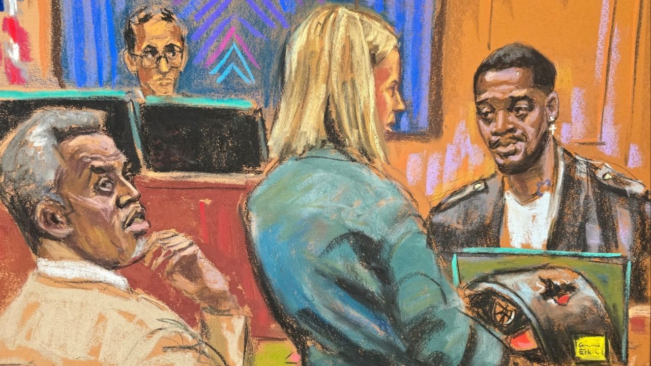 Prosecutor Emily Johnson questions rapper Kid Cudi as he testifies at Sean "Diddy" Combs' sex trafficking trial in New York City, New York, U.S., May 22, 2025 in this courtroom sketch. (Reuters File)