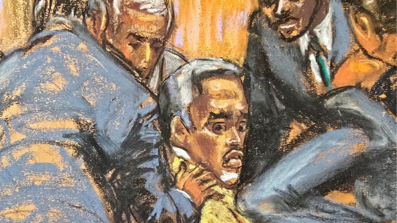 Defense lawyers comfort Sean "Diddy" Combs while discussing how to handle a note sent by jurors that they had reached a verdict on four of the five counts against him, during Combs' sex trafficking trial in New York City, New York, U.S., July 1, 2025, in this courtroom sketch. (Reuters/Jane Rosenberg)