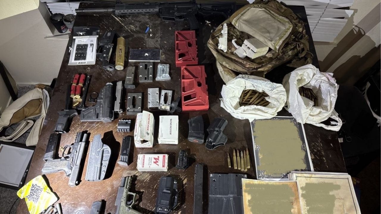 A search warrant was served at the apartment, where officers found multiple firearms, ammunition, a homemade suppressor, various gun parts, and a gang-related manifesto.
