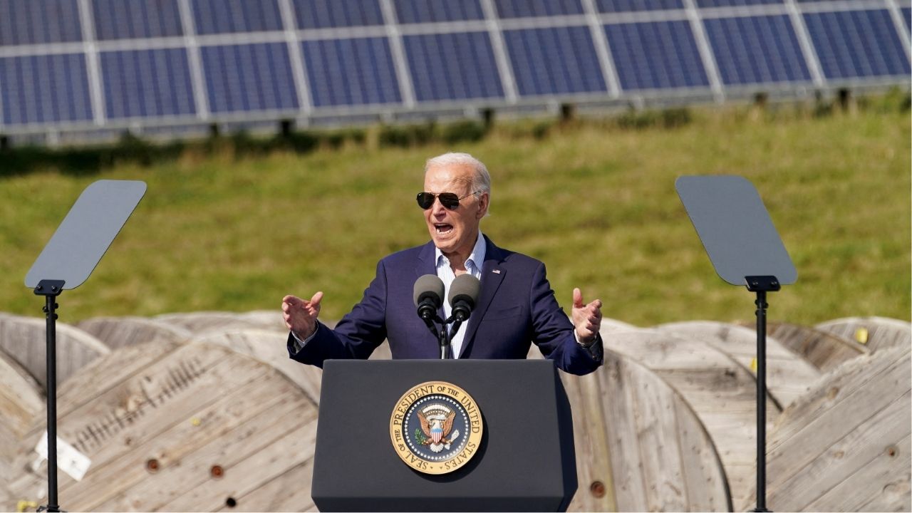 Solar panels at the background as U.S. President Joe Biden speaks during a visit to Vernon Electric Cooperative in Westby, Wisconsin, U.S., September 5, 2024. (Reuters File)
