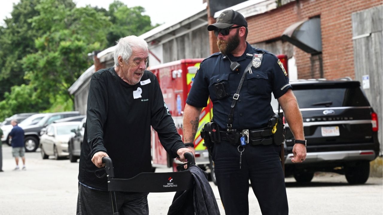 A resident of Gabriel House Assisted Living Facility is assisted by a Fall River police officer outside an emergency shelter set up at the Timao Center, after a deadly fire broke out in Fall River, Massachusetts, U.S. July 14, 2025. (Reuters/Ken McGagh)