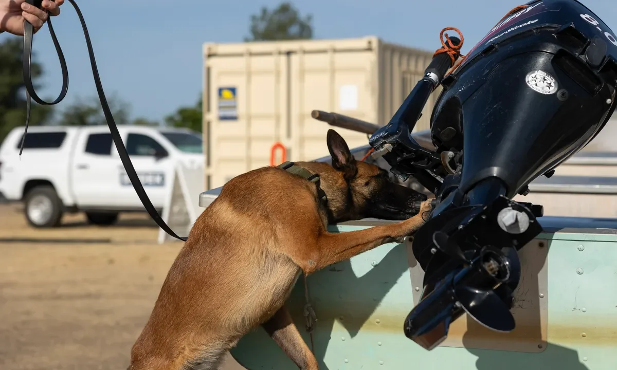 The dog’s handler, California Department of Fish and Wildlife Warden Mark Rose, pointed at the outboard motor and the dog delicately nosed the propellers. She stretched up on her hind legs to get a good whiff of the port side before Rose led her away. She yawned. Nothing here.