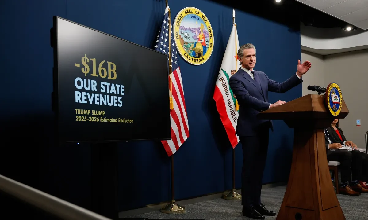 Gov. Gavin Newsom talks about his revised budget proposal in Sacramento, May 14, 2025. (CalMatters/Fred Greaves)