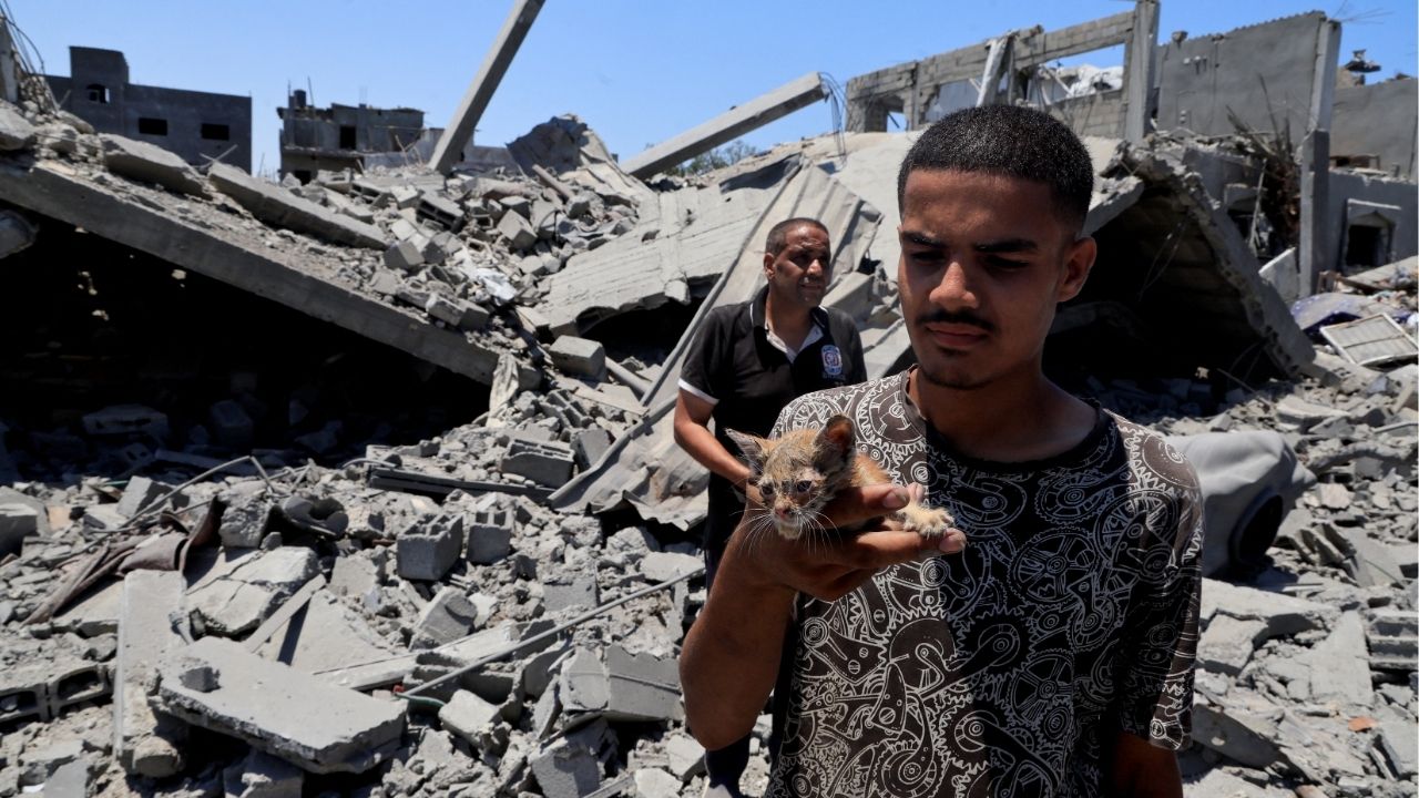 A Palestinian holds a cat as he inspects houses destroyed during an Israeli military operation, in Deir al-Balah, central Gaza Strip, July 23, 2025. (Reuters File)