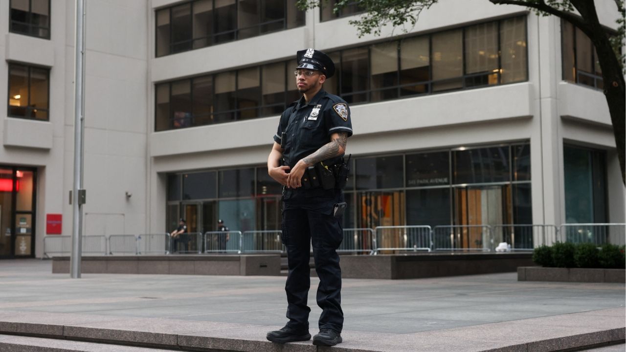A NYPD officer stands in front of the building where a shooting had taken place the day before in the Manhattan borough of New York City, U.S., July 29, 2025. (Reuters/Kylie Cooper)