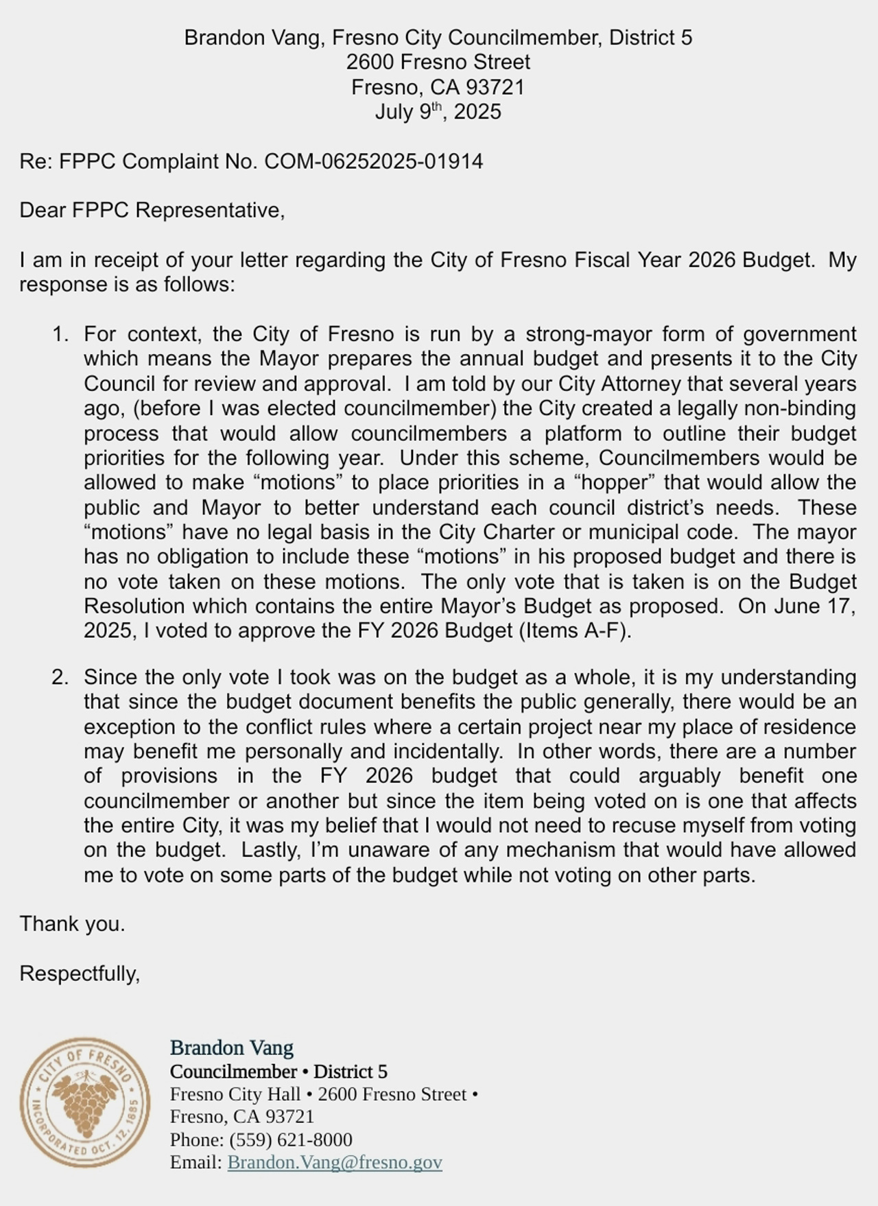 - Fresno City Councilmember Brandon Vang faces scrutiny from the FPPC over a budget motion that may benefit his home.