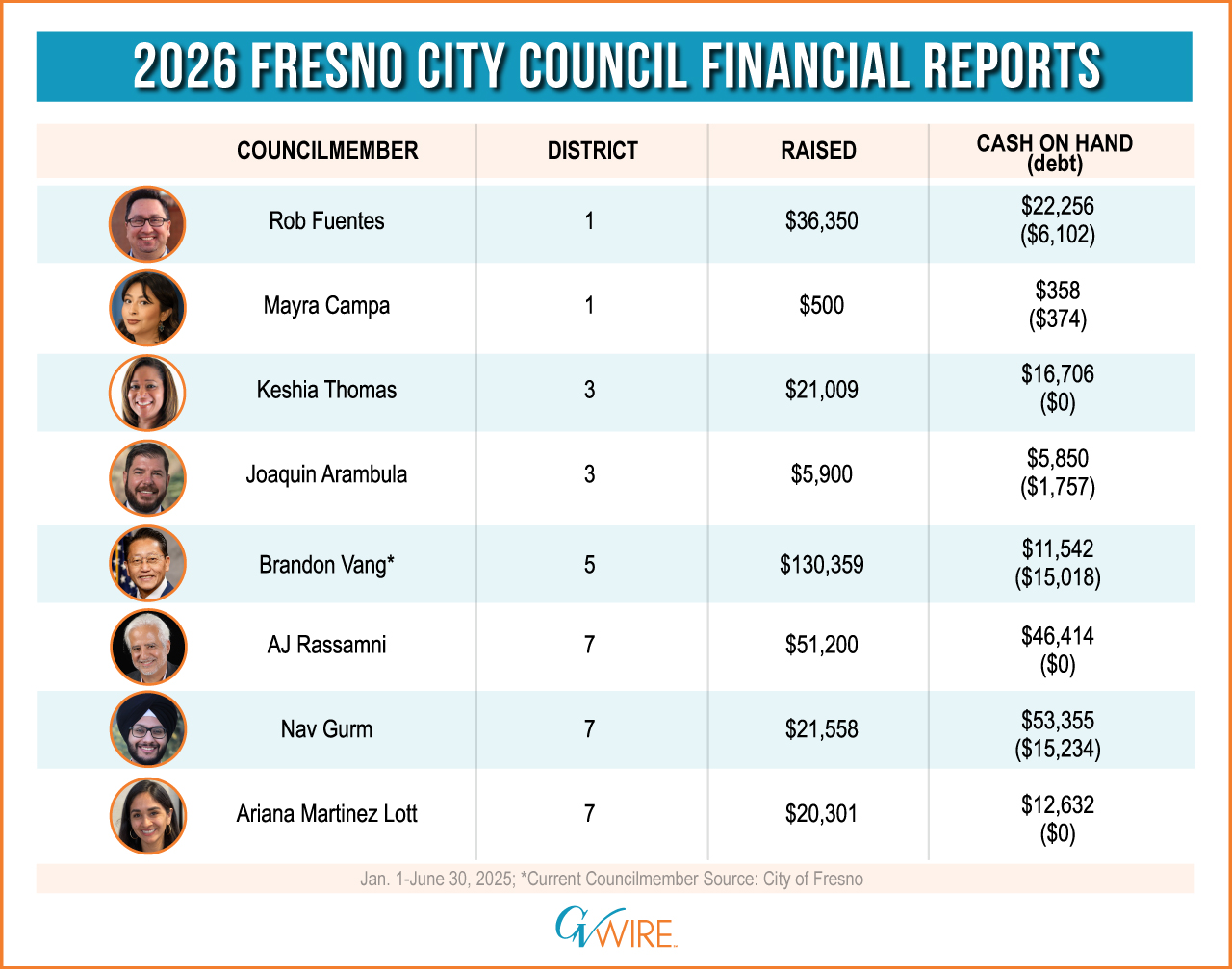 Vang raised the most between Jan. 1 and June 30 of 2025, winning a special election for the vacant seat on March 18. The district covers southeast Fresno.