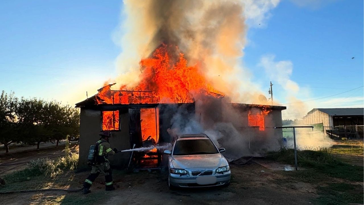 A house fire south of Selma on Monday, August 4, 2025, morning displaced two adults and injured a dog, with the cause under investigation. (CalFire)