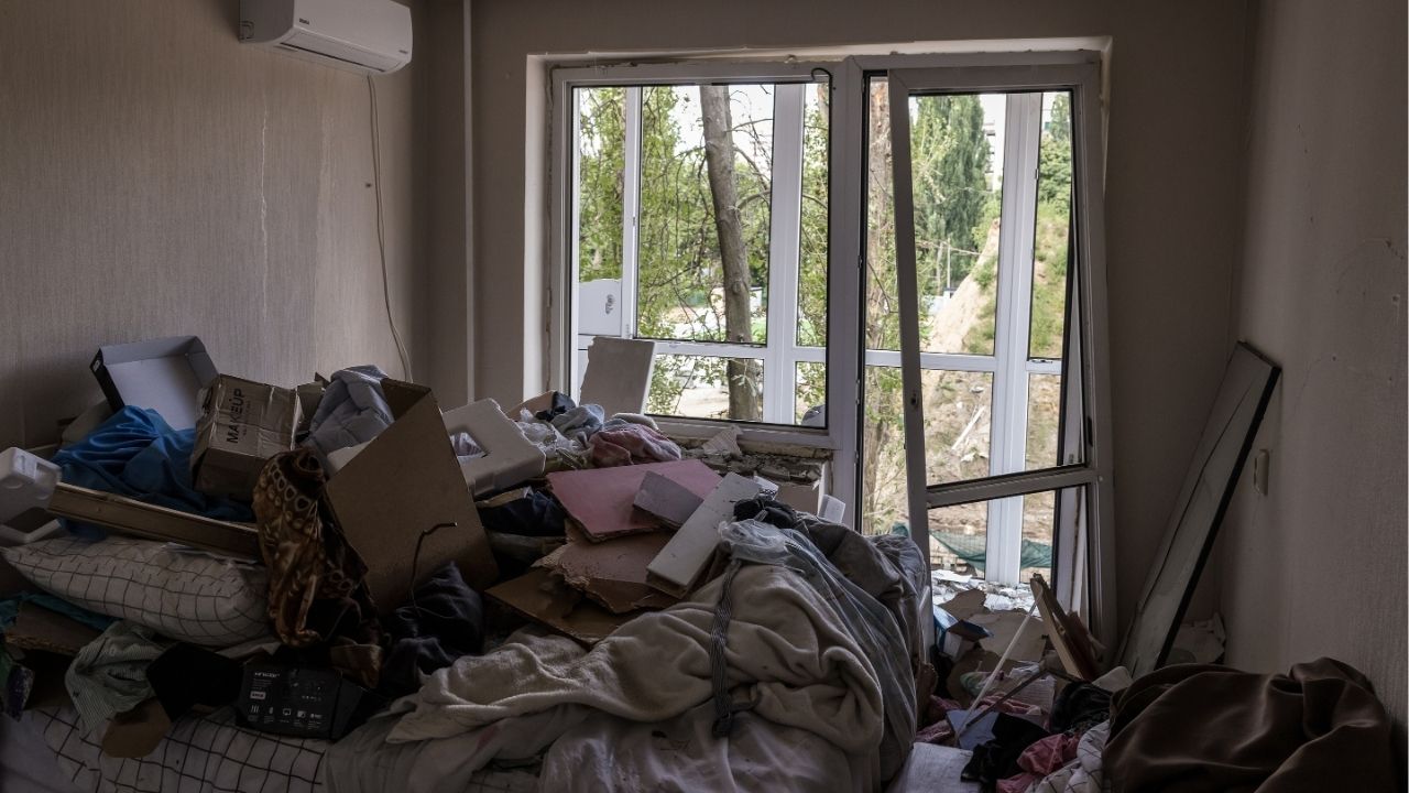 A view inside one of the apartments in the residential building that was partly destroyed by a Russian missile the night of July 31 in Kyiv, Ukraine, Aug. 4, 2025. Veronika Osintseva went to sleep in her bed on the ninth floor of an apartment building in Kyiv and woke up on a pile of rubble outside. She saw her leg covered in blood and cried out for help, thinking only of the pain, she would later say, and not how she had survived. (Oksana Parafeniuk/The New York Times)