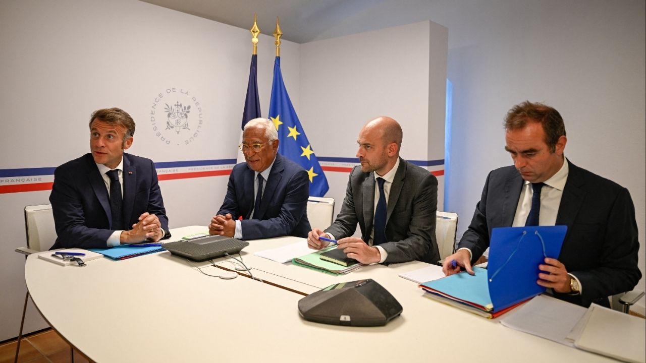 French President Emmanuel Macron, Antonio Costa, President of the European Council, French Minister for Europe and Foreign Affairs Jean-Noel Barrot, and France's Minister of Armed Forces Sebastien Lecornu attend a video conference with U.S. President Donald Trump, Ukrainian President Volodymyr Zelenskiy and European Union leaders about the upcoming Trump-Putin meeting on Ukraine, at Fort de Bregancon in Bormes-les-Mimosas, France, 13 August 2025. PHILIPPE MAGONI / POOL/Pool via REUTERS