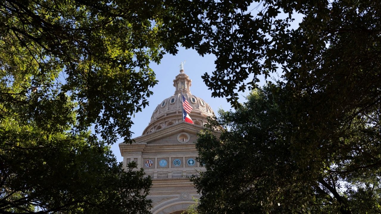 U.S. and Texas state flags fly at the Texas Capitol building, amid a redistricting battle between Republicans and Democratic state lawmakers in Austin, Texas, U.S., August 18 2025. (Reuters/Nuri Vallbona)