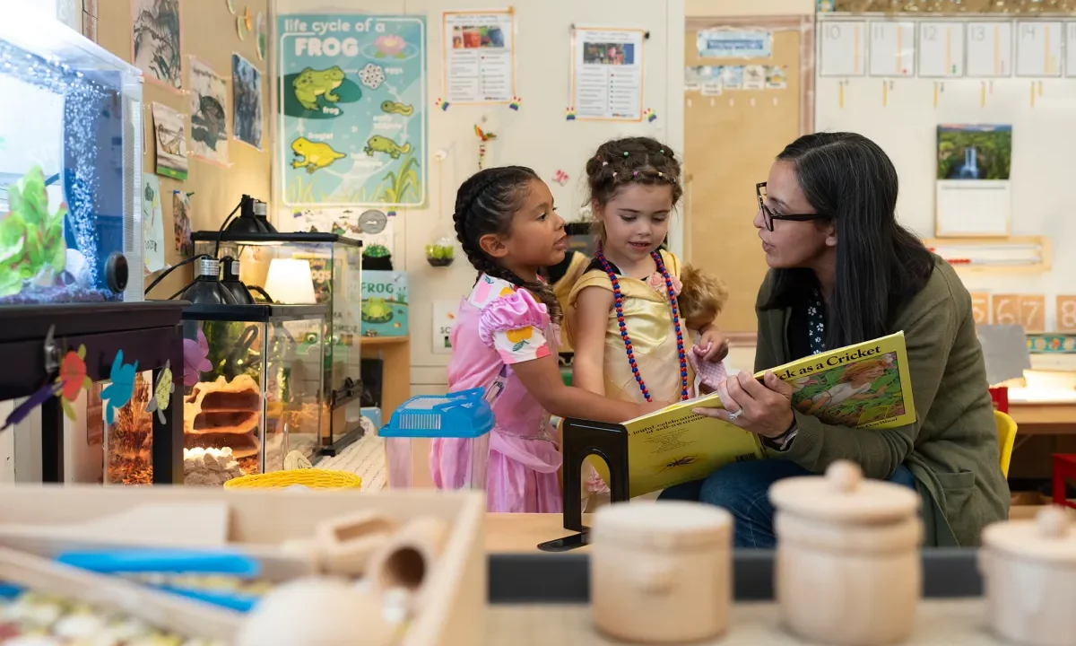 Transitional kindergarten instructional assistant Nancy Espino reads a book about crickets to children at Silverwood Elementary School in the Mt. Diablo Unified School District in Concord, Aug. 11, 2025. (CalMatters/Laure Andrillon)