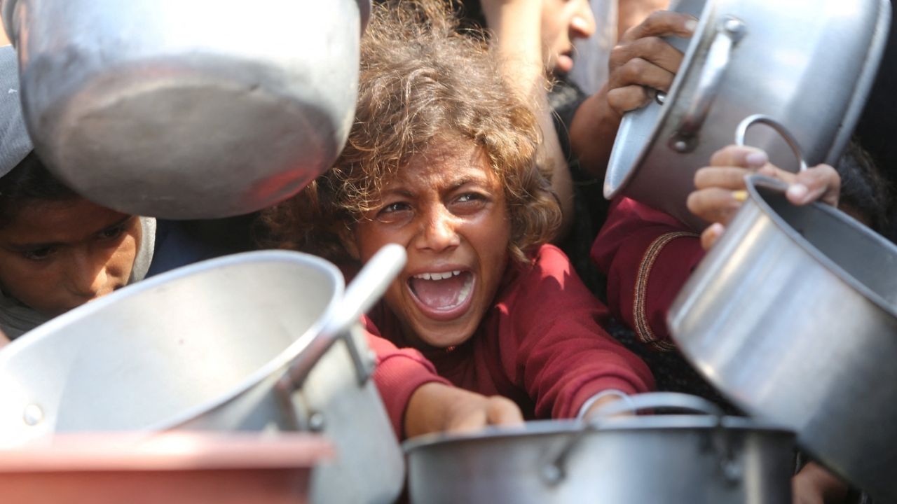 A child reacts surrounded by pots as Palestinians wait to receive food from a charity kitchen in Khan Younis, southern Gaza Strip, August 21, 2025. (Reuters/Hatem Khaled)