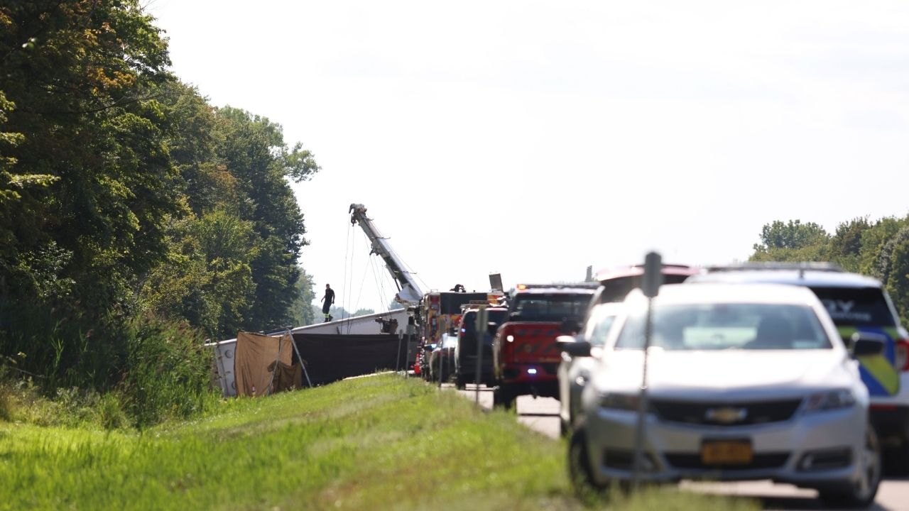 First responders work at the scene of a bus crash on the New York State Thruway about 30 miles east of Buffalo, N.Y., on Friday afternoon, Aug. 22, 2025. The tour bus traveling from Niagara Falls to New York City crashed on a highway outside Buffalo on Friday, killing multiple passengers, including at least one child, and leaving some people trapped beneath the vehicle, officials said. (Lauren Petracca/The New York Times)