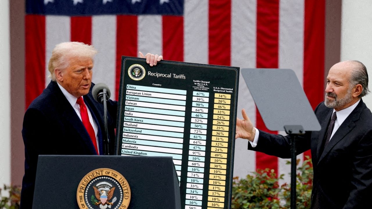President Donald Trump holds a chart next to U.S. Secretary of Commerce Howard Lutnick as Trump delivers remarks on tariffs in the Rose Garden at the White House in Washington, D.C., U.S., April 2, 2025. (Reuters File)