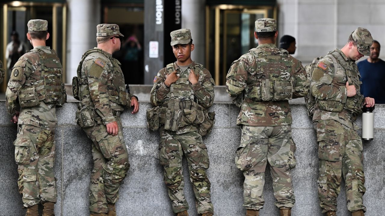 Soldiers with the 30th Armored Combat Brigade from the South Carolina National Guard at Union Station in Washington, Aug. 20, 2025. Defense Secretary Pete Hegseth has authorized National Guard troops deployed to Washington to bring their weapons with them on their mission. (Kenny Holston/The New York Times)