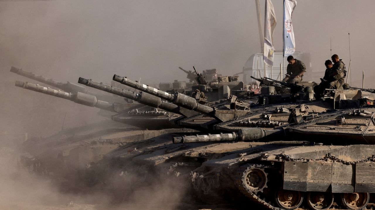 Israeli soldiers sit on top of tanks at the Israel-Gaza border, as seen from Israel, August 26, 2025. (Reuters/Amir Cohen)