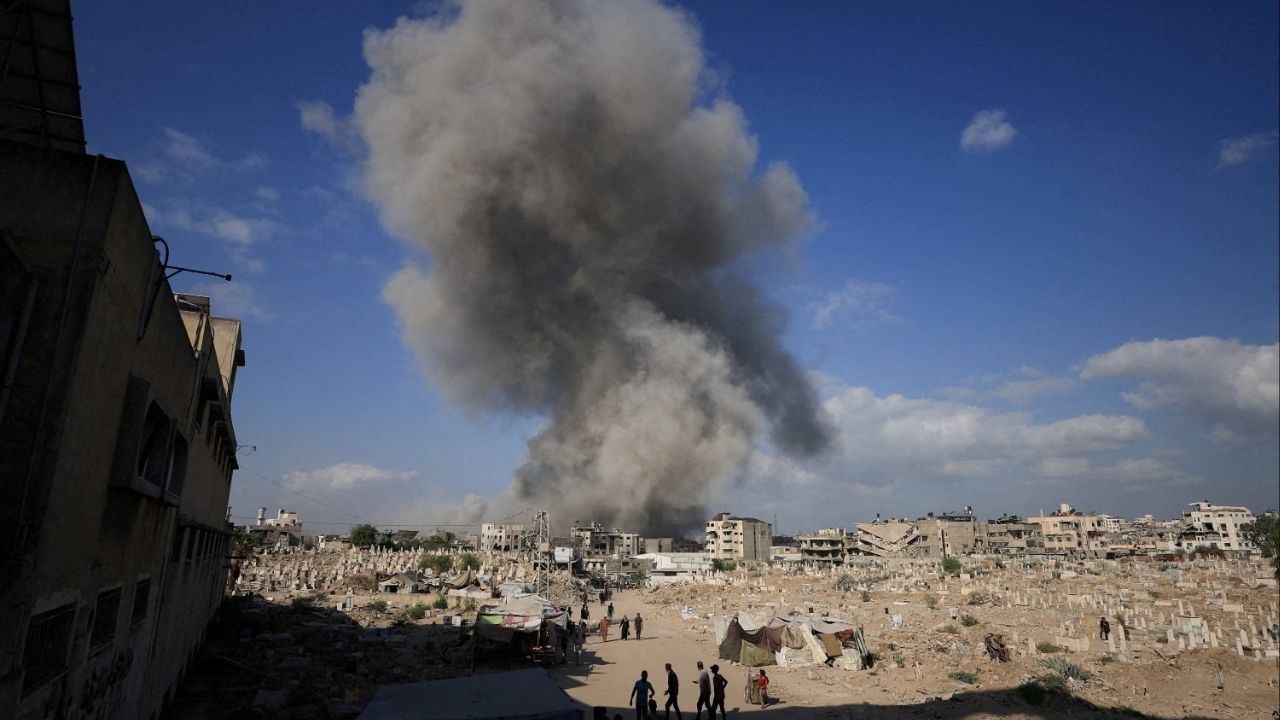 Palestinians gather near a cemetery as smoke rises following an explosion during an Israeli operation in Gaza City, August 28, 2025. (Reuters File)