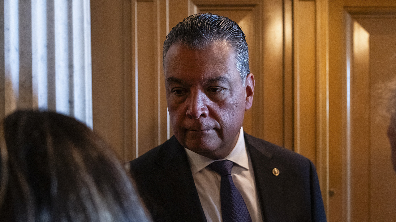 Sen. Alex Padilla (D-Calif.) speaks to reporters at the Capitol in Washington, May 14, 2025. (Eric Lee/The New York Times)