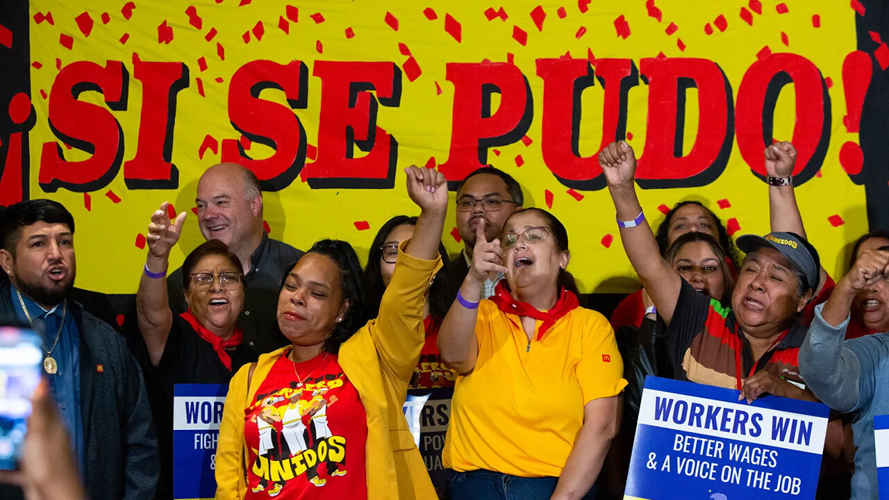 Fast food workers cheer before Gov. Gavin Newsom signs legislation boosting wages to $20 an hour during a news conference at SEIU Local 721 in Los Angeles, Sept. 28, 2023. (CalMatters/Alisha Jucevic/File)