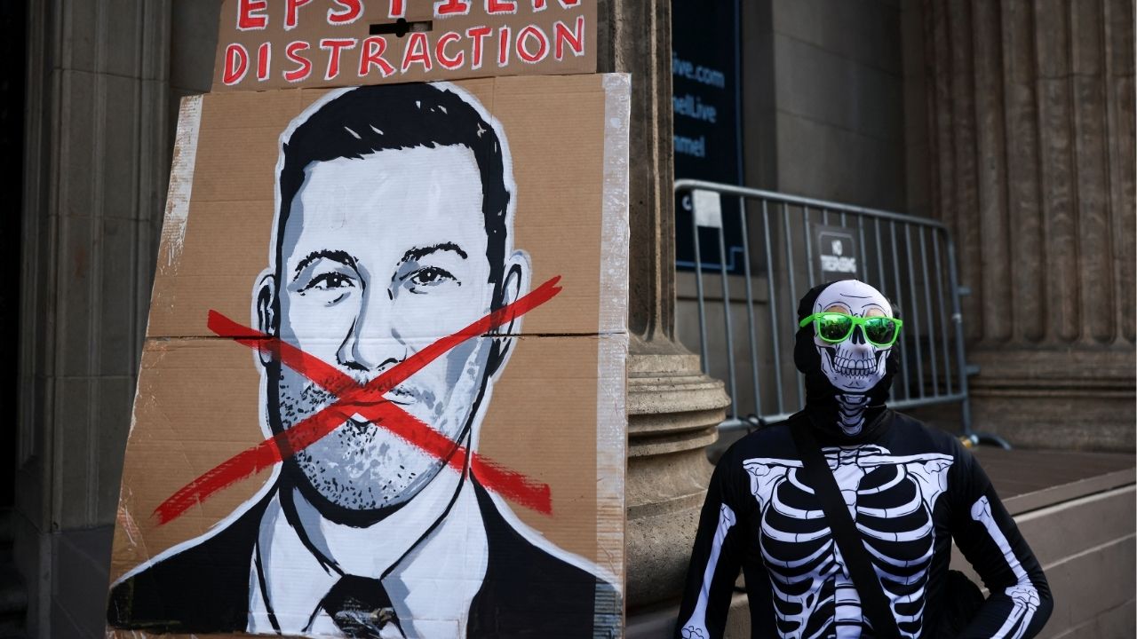 A demonstrator dressed in a skeleton suit stands next to a sign featuring Jimmy Kimmel, during a protest at the El Capitan Entertainment Centre, where "Jimmy Kimmel Live!" was recorded for broadcast, following his suspension for remarks he made regarding Charlie Kirk’s assassination, on Hollywood Boulevard in Los Angeles, California, U.S. September 18, 2025. (Reuters/David Swanson)