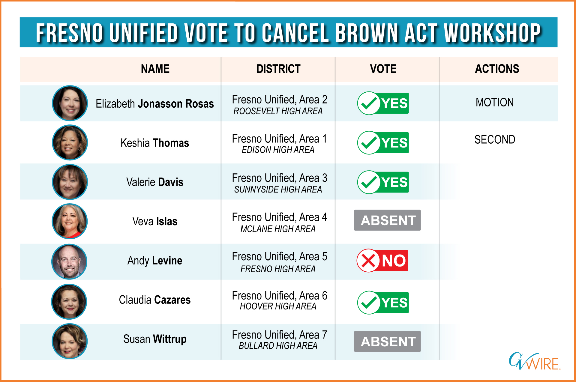 However, minutes after board members, top district staff, outside attorneys, and Fresno Teachers Association leaders gathered for the meeting, Trustee Elizabeth Jonasson Rosas made a motion to cancel the meeting. Jonasson Rosas, board chairman Valerie Davis, and trustees Keisha Thomas and Claudia Cazares voted yes, and Trustee Andy Levine voted no.