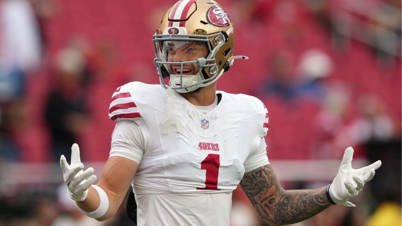 Sep 28, 2025; Santa Clara, California, USA; San Francisco 49ers wide receiver Ricky Pearsall (1) before the game against the Jacksonville Jaguars at Levi's Stadium. (Darren Yamashita-Imagn Images)