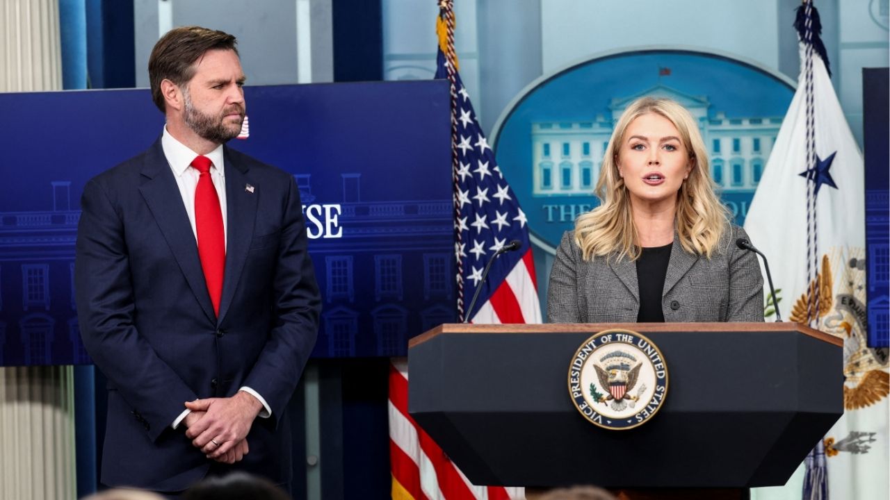 U.S. Vice President JD Vance listens as White House Press Secretary Karoline Leavitt speaks to reporters during a press briefing in Washington, D.C., U.S., October 1, 2025. (Reuters/Kevin Lamarque)