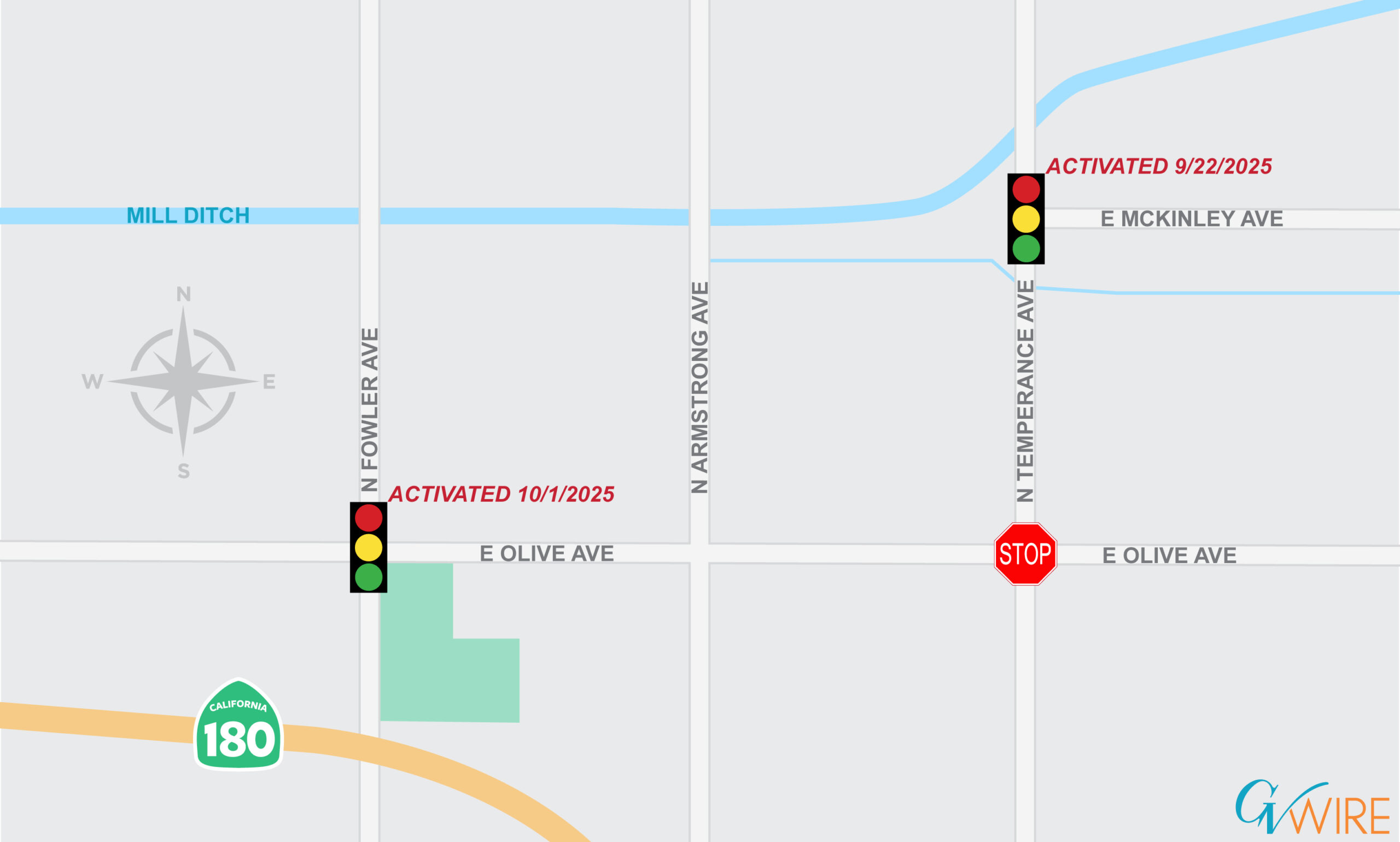 For 10 months, traffic signals stood dark at a busy southeast Fresno intersection — poles and lights installed but inactive. Drivers waited at temporary stop signs at Fowler and Olive avenues to access Highway 180.