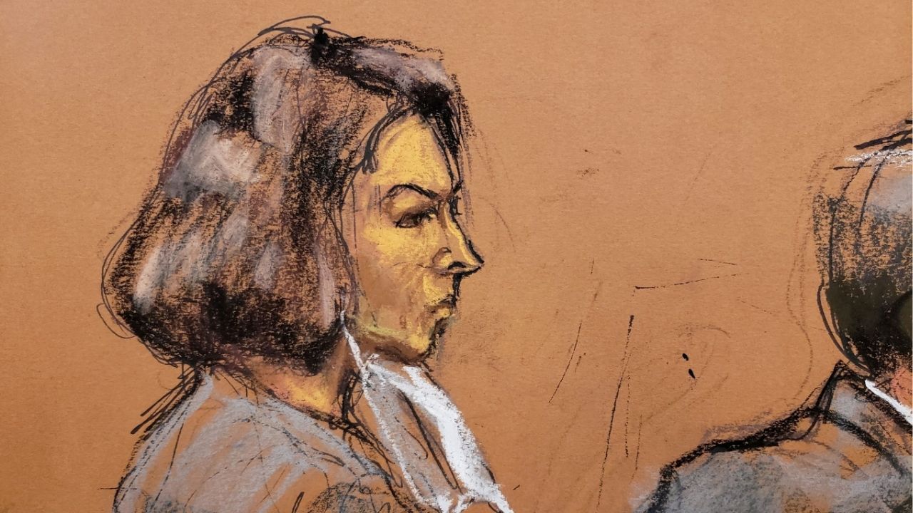 Jeffrey Epstein associate Ghislaine Maxwell sits at the defense table as juror number 50 answers questions from Judge Alison Nathan about his answers on the juror questionnaire in a courtroom sketch in New York City, U.S., March 8, 2022. (Reuters File)
