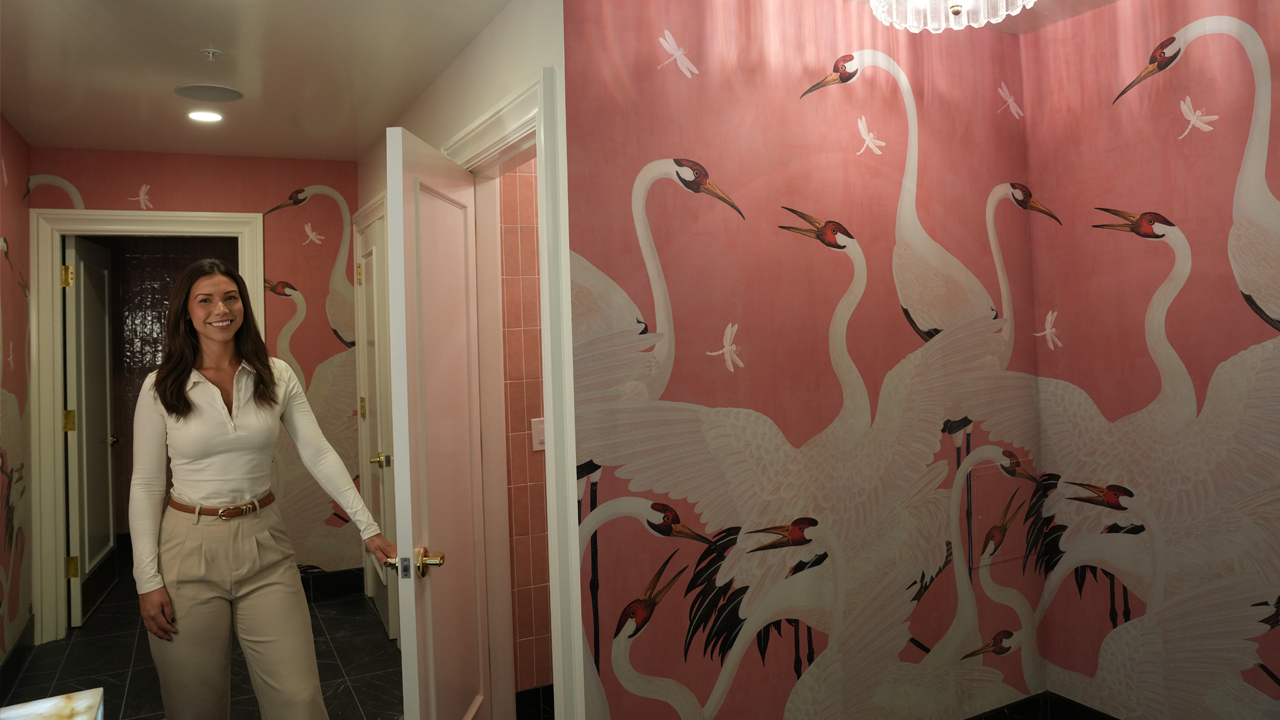 Designers used Gucci wallpaper to decorate the women’s bathroom. (GV Wire/Edward Smith)