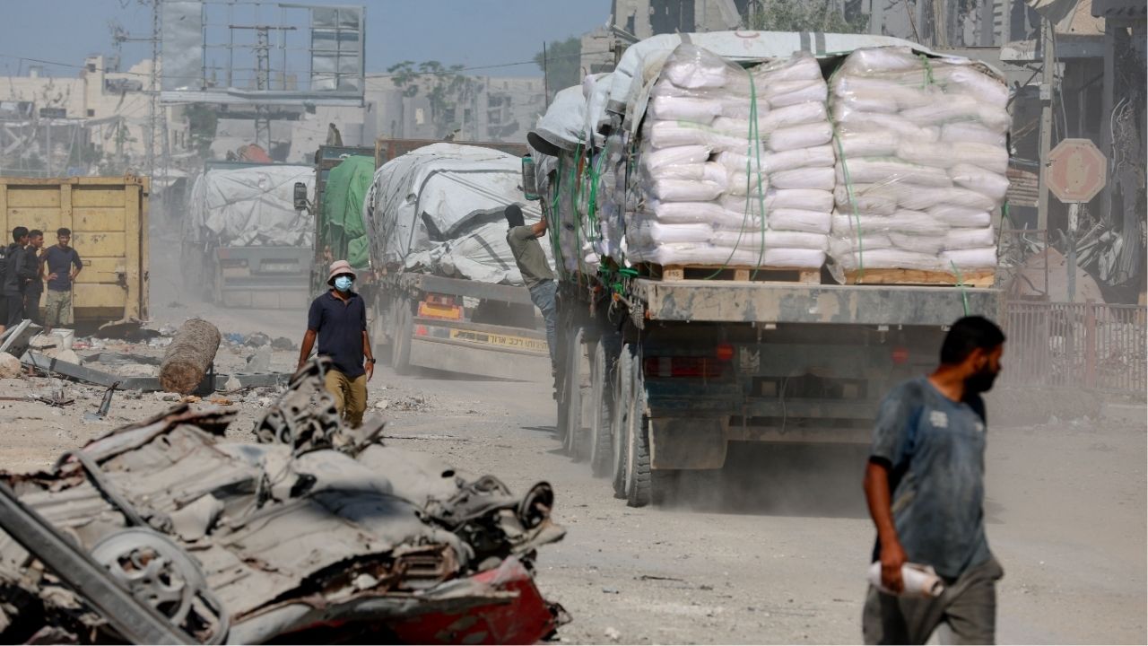 Trucks carry aid for Palestinians, amid a ceasefire between Israel and Hamas in Gaza, in Khan Younis, in the southern Gaza Strip, October 14, 2025. (Reuters/Ramadan Abed)