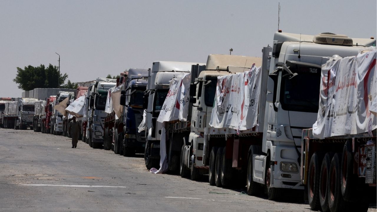 Trucks carrying humanitarian aid line up near the Rafah border crossing between Egypt and the Gaza Strip, in Rafah, Egypt, August 6, 2025. (Reuters/Amr Abdallah Dalsh)