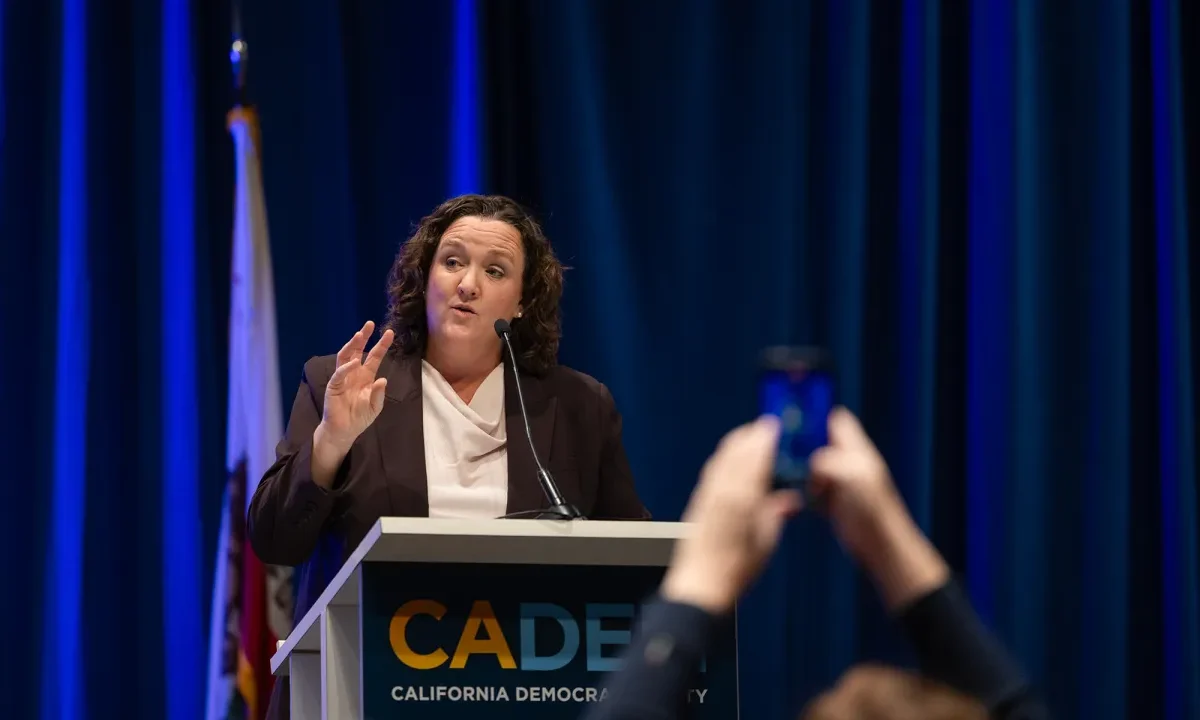Then-U.S. Rep. Katie Porter, a Democrat from California, addresses the Women's Caucus at the Democratic Party convention in Sacramento, Nov. 17, 2023. (CalMatters/Miguel Gutierrez Jr./File)