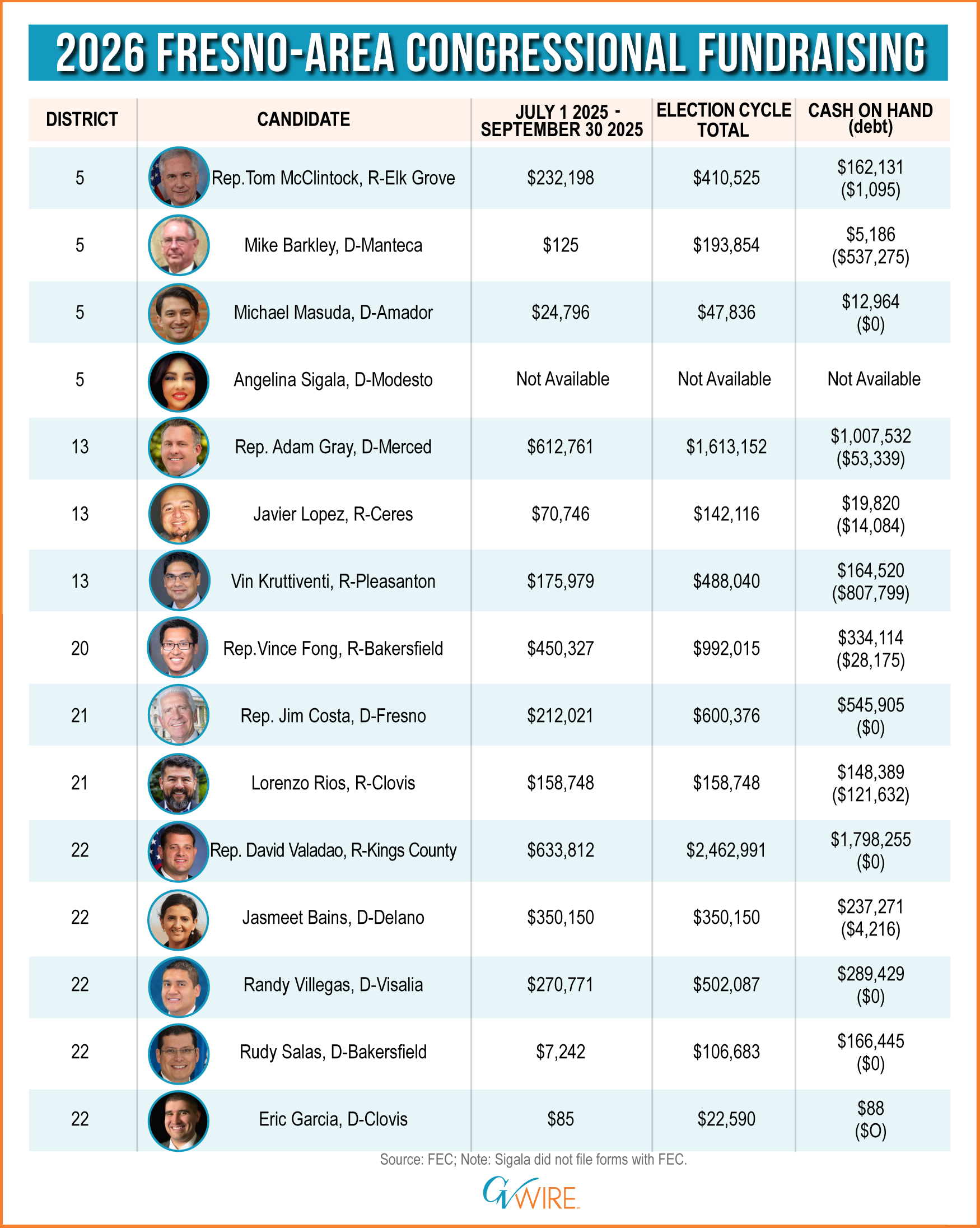 Rep. Jim Costa, D-Fresno, and veterans advocate Lorenzo Rios, R-Clovis, were relatively close for the quarter. Costa leads substantially overall and in cash on hand.
