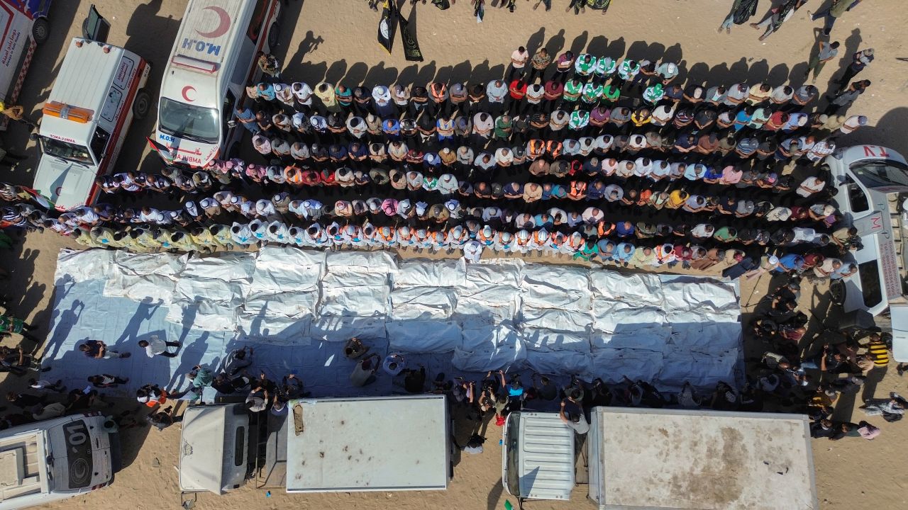 Mourners pray as Gazan civil defense workers bury the remains of dozens of unidentified Palestinians, returned by Israel as part of the ceasefire deal, south of Deir al-Balah in the Gaza Strip, Wednesday, Oct. 22, 2025. The cease-fire has come under increasing strain in recent days, and several Trump officials, speaking in anonymity, said there was concern within the administration that Israel might vacate the deal. (Saher Alghorra/The New York Times)