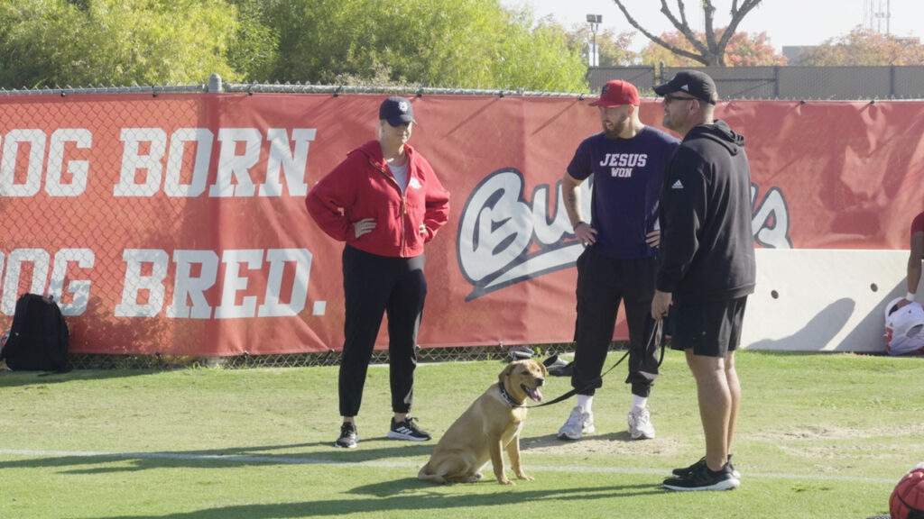 Head coach Matt Entz has mentioned his dog in prior news conferences. On Tuesday, he brought his Labrador, Tuddy, to practice.