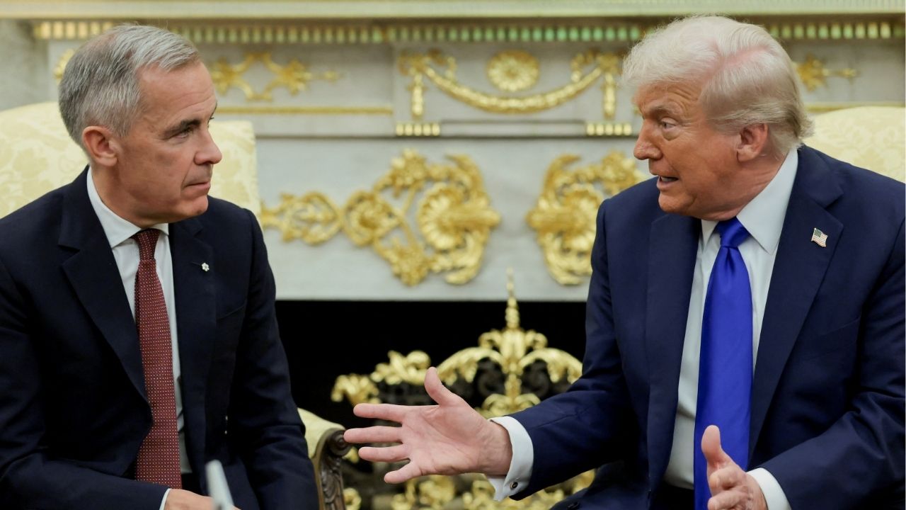 President Donald Trump and Canada's Prime Minister Mark Carney meet in the Oval Office at the White House in Washington, D.C., U.S., October 7, 2025. (Reuters/Evelyn Hockstein)