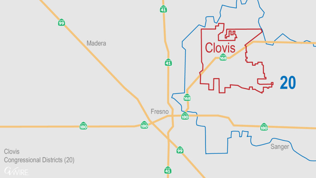 Congressional lines drawn in 2021 by the independent California Citizens Redistricting Commission placed the entirety of Clovis into Congressional District 20.