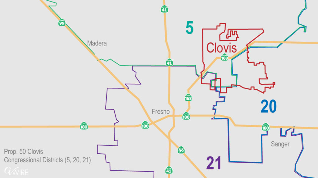A proposed redistricting measure on the Nov. 4 ballot, Proposition 50, would divide Clovis into three congressional districts and expand Fresno’s representation to four. (GV Wire Composite)