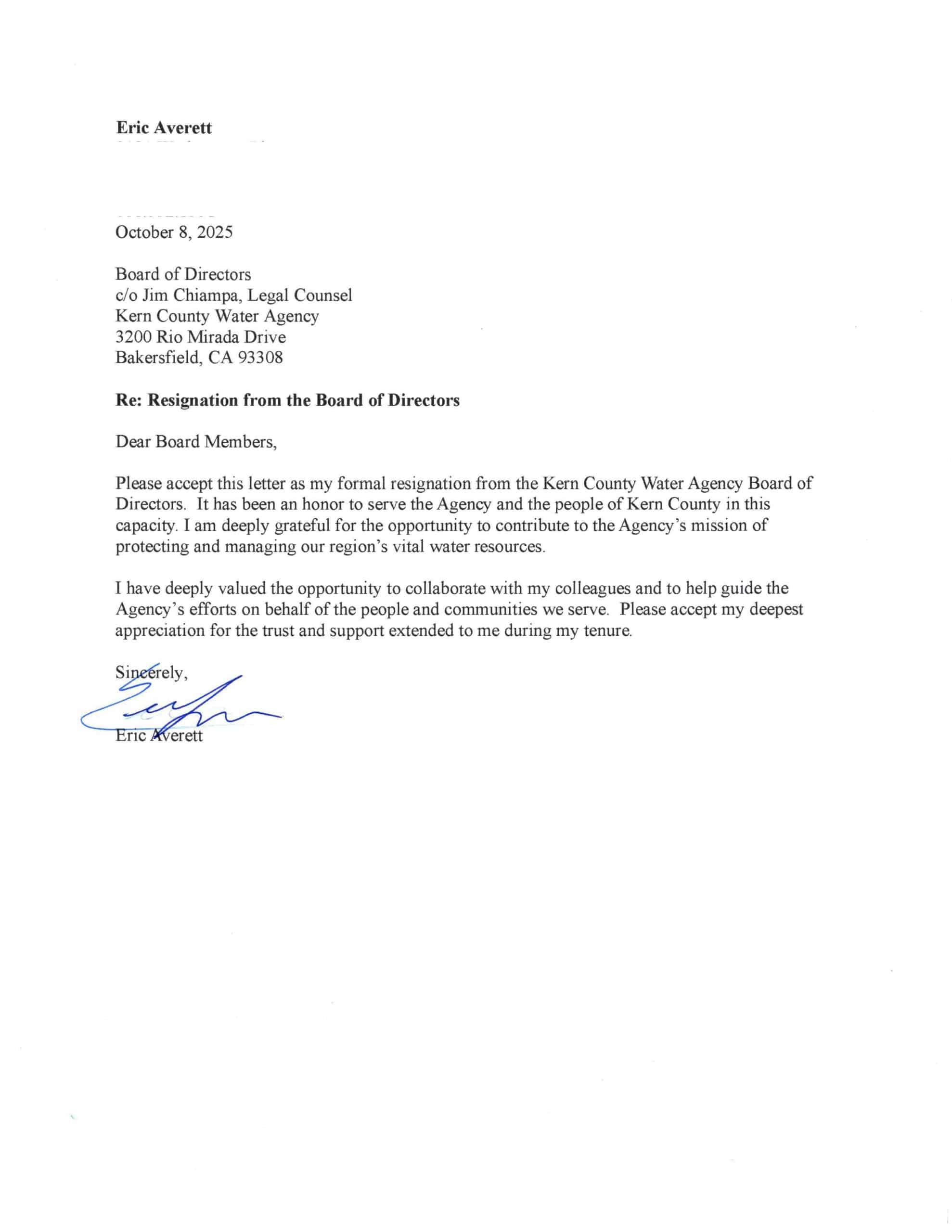 “Dear Partners and Friends,” the email states. “I am reaching out to share that I have stepped down from the Board of the Kern County Water Agency and have accepted the position of General Manager of the organization.
