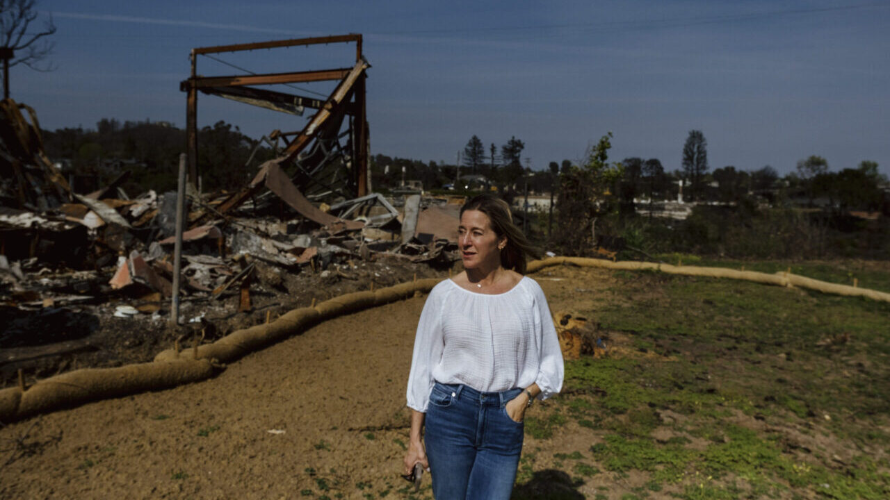 Maggie Neilson, whose home insurer elected not to renew her coverage months before the fires, visits the ruins of her 1924-built home in the Pacific Palisades neighborhood of Los Angeles on April 24, 2025. The only insurer Neilson could find was the state FAIR plan, which charged her about 40% more, for about 40% less coverage. She now expects to receive $1.5 million for a rebuild that is likely to cost around $3 million. (Mark Abramson/The New York Times)